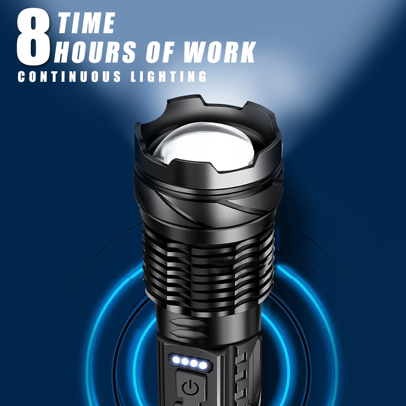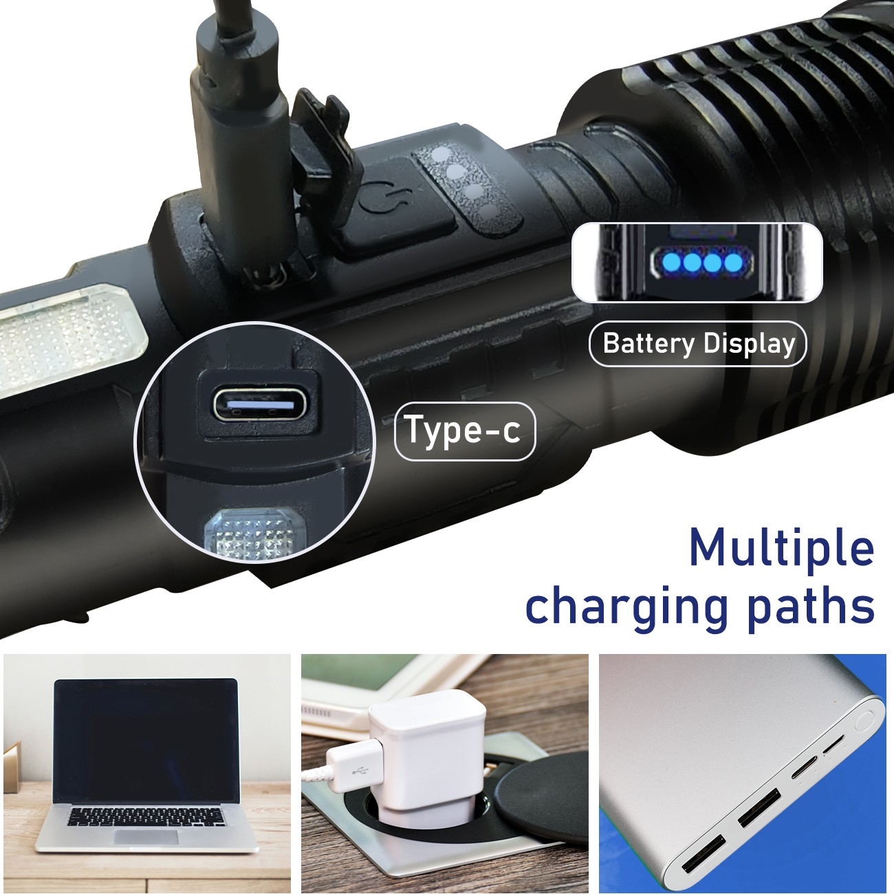 【USB Input and Power display 】 Rechargeable flashlight has an Type-C input port and power display. Support USB charging. You can charge with a laptop, car charger, charging treasure, etc.